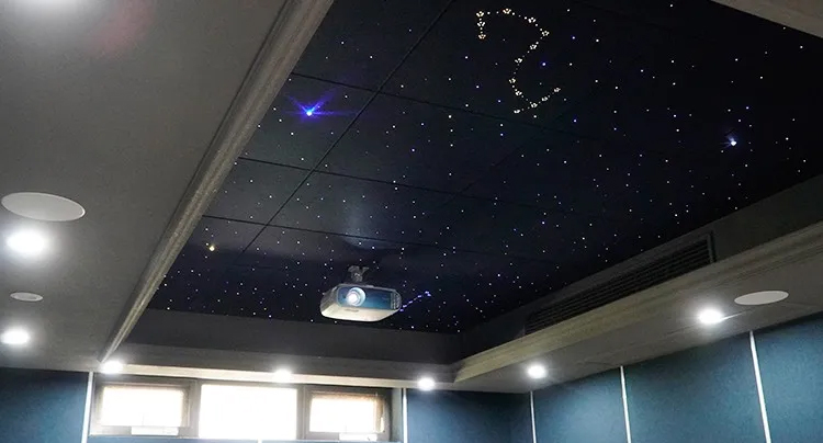 由于中間有一個大的橫梁,所以星空頂我們分成了2塊,大面積星空頂設(shè)計,可以更好的去滿足影院混響時間的要求,同時看電影氛圍感更好,再一個就是可以更好的避免與地面之間的顫動回聲。