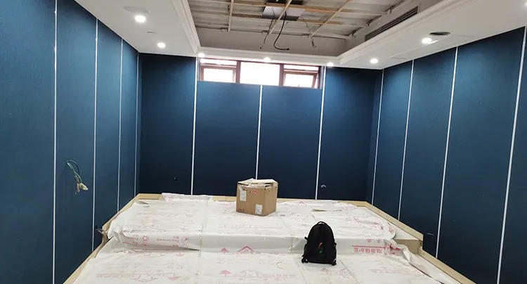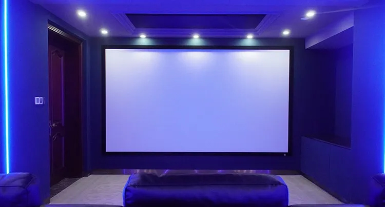 為了控制影音室的混響時間,還有低頻駐波,我們借助前墻的空間做了大面積的低頻陷阱,四個墻面都做了吸聲與擴散的聲學(xué)材料,外飾面為專用透聲布,為了讓進到影院更有感覺,墻面我們做了一定線性燈帶的修飾。