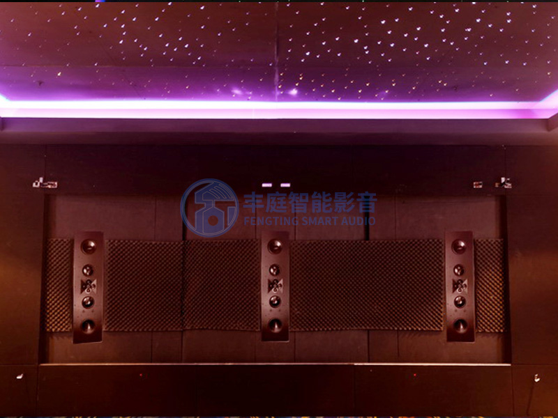 音頻采用全景聲7.3.4設計,考慮到低頻的體感,后排沙發單獨配置了一臺密閉炮,同時地臺按照木質結構打造,同時考慮到前后排的聲壓覆蓋,6.5米的試聽距離,影院前三采用的是james的定制安裝系列808be,寬廣的中高頻銜接,既保證高頻透過幕布的后的聲壓級,又讓聲音不刺耳耐聽,為了充分抵消駐波,前墻用了兩只12寸低音炮,配合后墻炮既滿足體感,也讓低頻更干凈。