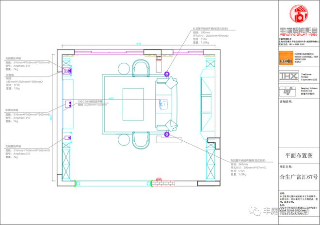 整個空間近40平,實際觀影區在30平,為了讓空間盡可能的美觀和協調,我們做了一套外置加隱藏結合的影音系統,整體音頻按照5.1聲道來設計。
