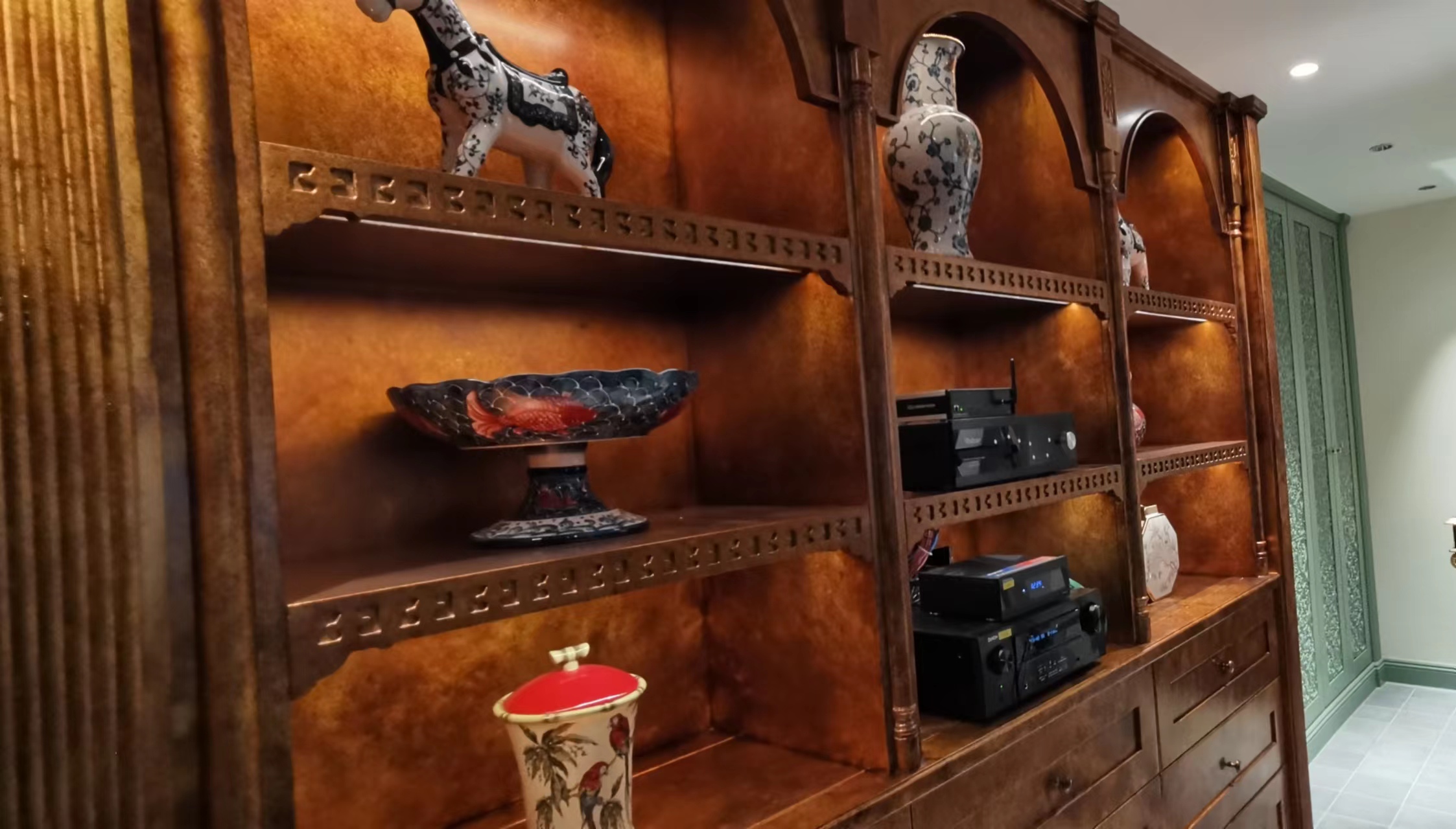東方傳奇的藝術珍品加上亞歷山大的全套藏品沙發,金箔鑲嵌的裝飾柜和巴洛克風格的獨特線條,所有的功能和裝飾性擺件都是客戶漂洋過海搬到新家。