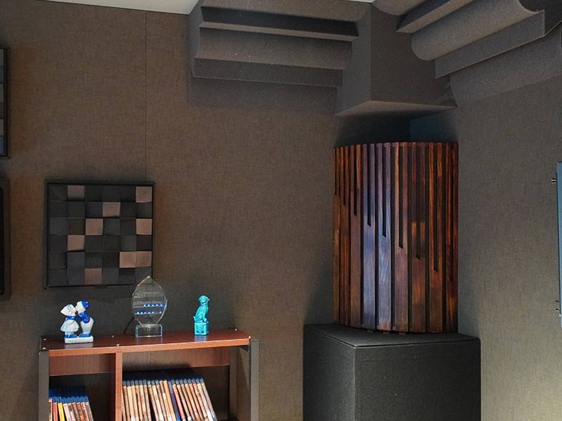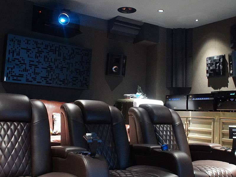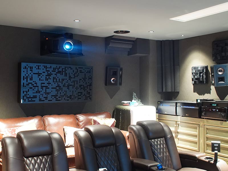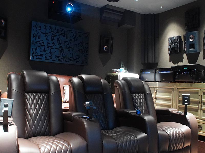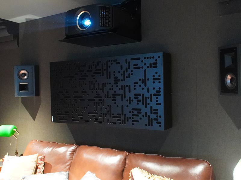 既然要做到影院級的視聽效果,除了影音設備外,視聽的聲學處理也是必不可少的。在不影響整體造型美觀度的前提下,比較不一樣的在于后墻的處理,設計初衷將整面后墻主要擴散區域用3D立體擴散體布置,在配套燈光的映襯下,保證良好聲學特性的原則之外,又能兼顧良好的觀感,何樂不為呢?(3D擴散體能通過它的立體表面對音波進行不同角度的傳導,消除音波在擴散過程中的盲區,改善音質,平衡頻響,優化聲場,營造高密度的環繞包圍感;比較多用于做球形擴散,布置在環繞揚聲器區域)。