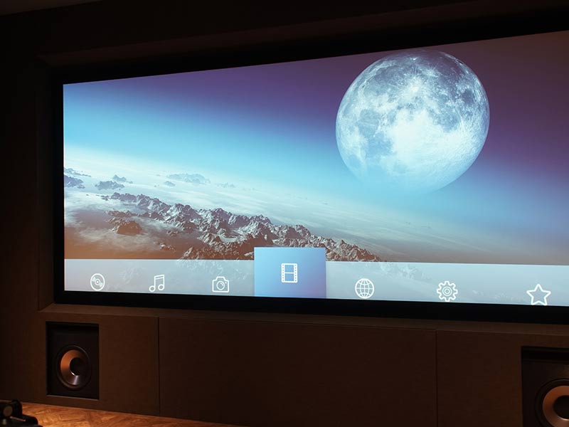 在對于視頻部分結合前墻寬度以及沙發觀影距離的觀影舒適度,設計之初考慮了2.35:1的寬熒幕,這也是好萊塢電影的拍攝比列標準,同樣為了消除環境的光污染,四個墻面做的都是深顏色的透聲布修飾尤其是吸頂的揚聲器都按照磨砂黑定制,投影選擇了jvs的的n98,經過isf專業視頻調后,黑位深沉,亮部飽滿色彩準確